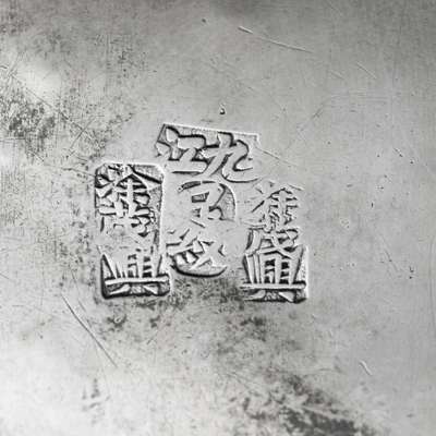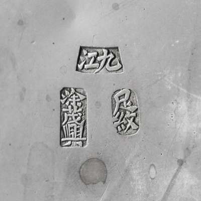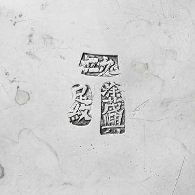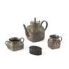 comprising a tea pot and cover, a milk jug and a cream pot, each finely repoussé worked with a myriad of martial figures amongst scrolling foliage, each bearing three marks to the base reading 'Jiu Jiang', 'Tu Maoxing' and 'Zu Wen' (sterling silver); together with a SILVER-INLAID METAL BOX AND COVER, CHEN MARK, 19TH CENTURY (4)