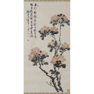 ink and colour on paper, inscribed with a four-line poem, signed 'Ni Shi Tian Weng Ban Ding Lao Ren' (painted in the style of Shen Zhou by Banding as an old man), with a total of four seals reading 'Zhu Huan', 'Ban Ding Lao Ren', 'Chen Nian' and 'Qiang Jun Yan Se Nai Ji Han', framed and glazed