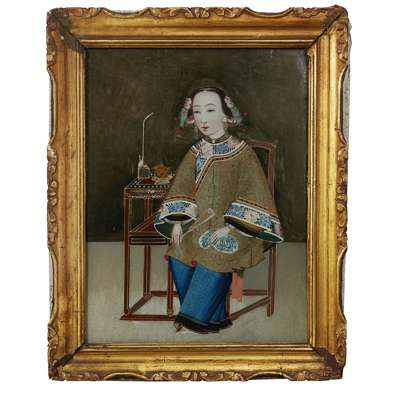 each depicting a wealthy lady seated beside a table displaying a vase and an opium pipe, in European gilt-wooden frames (2)