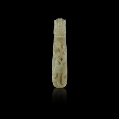 the first in the form of an archaistic dragon, the head forming the hook, facing a younger chilong clambering on the arched shaft, the knob in the form of a peony blossom; the second rendered as a phoenix (2)