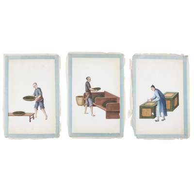 SET OF TWELVE RICE PAPER PAINTINGS DEPICTING TEA MAKING