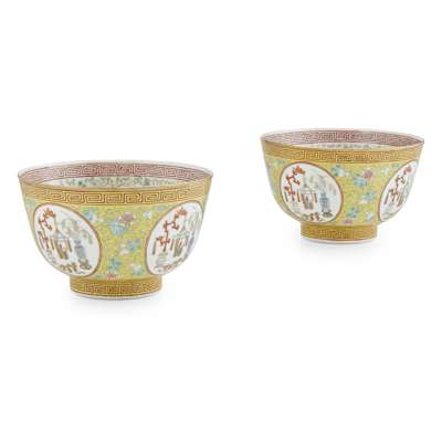 PAIR OF FAMILLE ROSE YELLOW-GROUND 'MEDALLION' BOWLS