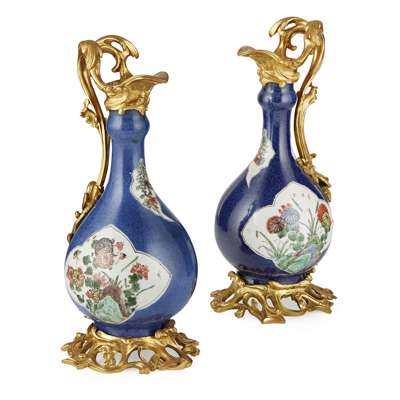 PAIR OF ORMOLU-MOUNTED FAMILLE VERTE POWDER-BLUE GROUND VASES