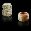 the first a celadon and russet jade archer's ring, the exterior carved in low relief with a dragon and a phoenix in pursuit of each other; the second a green jade cong-form bead, carved with a sinuous dragon
