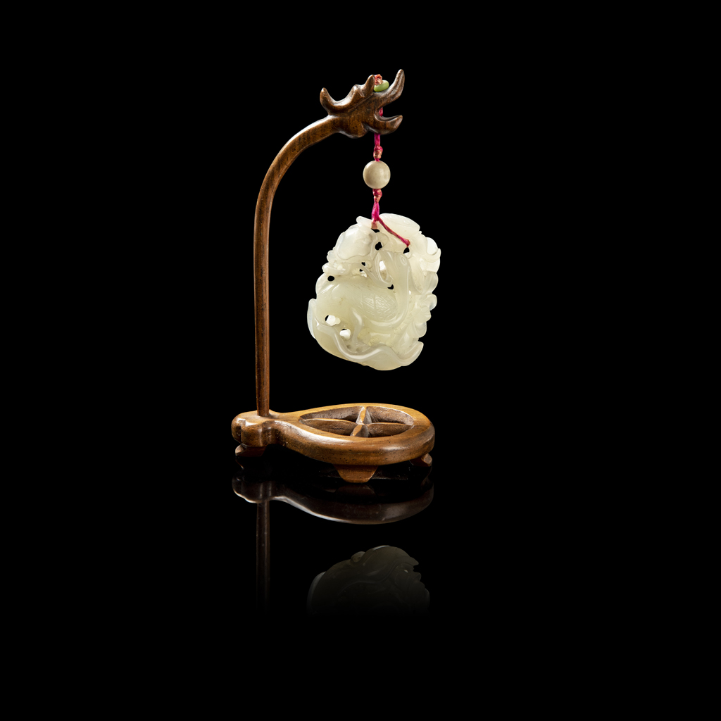 carved and pierced to depict a heron perched on a large lotus leaf, clasping a lotus pod in its beak and surrounded by sinuous stems issuing a lotus flower and lingzhi