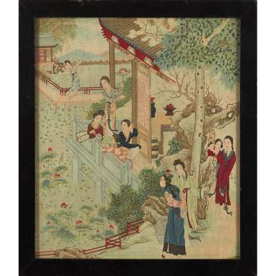 the first depicting Jia Baoyu, the principal figure of the novel, surrounded by beauties in the Grand View Garden, da guan yuan; the second depicting a beauty travelling on a ferry, each framed and glazed (2)