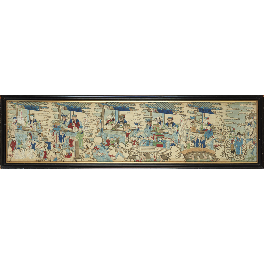 ink and colour on silk, depicting five courts of Chinese Hell, each presided over by a King, including King Pingdeng, King Biancheng, King Yanluo, King Songdi and King Qinguang, framed and glazed