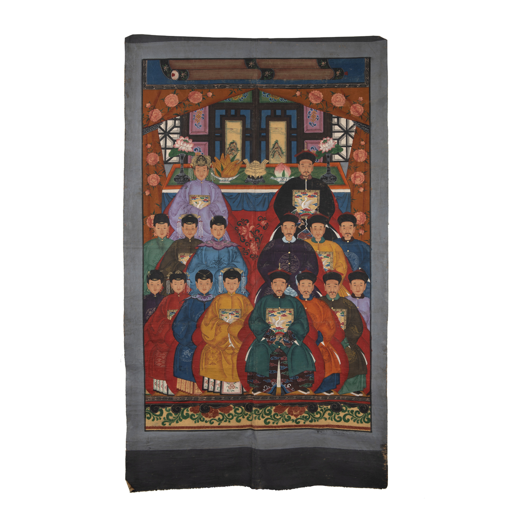 oil on canvas with gilt highlights, depicting a total of sixteen figures dressed in official's robes in front of an altar table