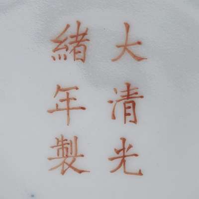 the exterior scattered with gilt shou roundels divided by iron red and gilt bats and blue enamel swastikas, all on a yellow ground, the base inscribed with a six-character iron red Guangxu reign mark