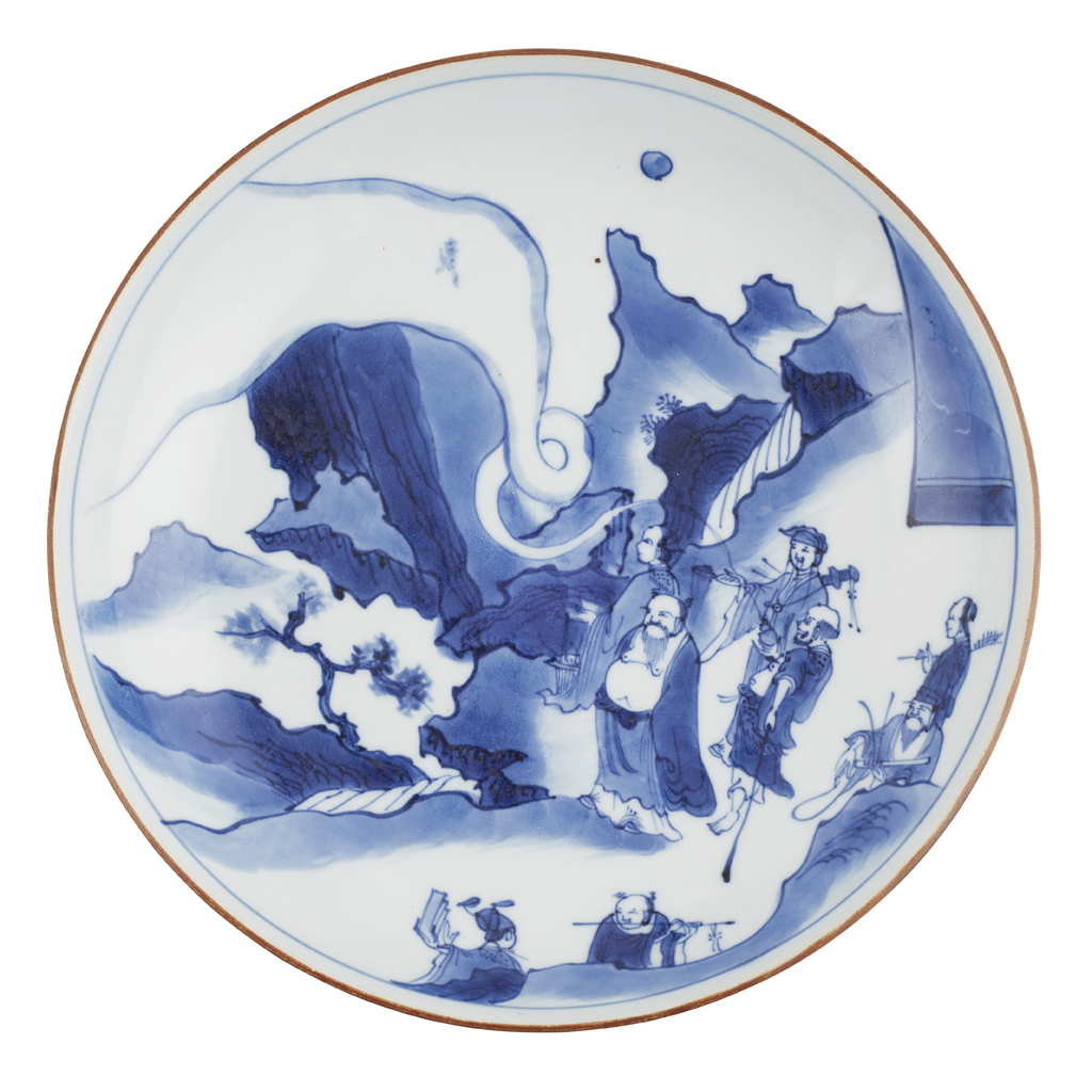 BLUE AND WHITE 'MASTER OF THE ROCKS' 'EIGHT IMMORTALS' DISH