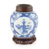 of compressed ovoid form, the flowers and the cracked ice pattern surrounding three lobed reserves each filled with an arrangement of objects of 'The Hundred Antiques', wooden cover and stand