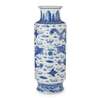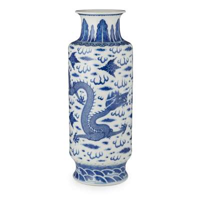 the cylindrical body painted in delicate shades of cobalt blue with a pair of five-clawed dragons flanking a flaming ball amongst stylised flames and ruyi clouds, below a waisted neck painted with a plantain leaf band and a ruyihead-collar, and above a waisted foot painted with crested waves, the base bearing a six-character apocryphal Yongzheng seal mark