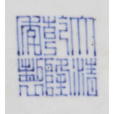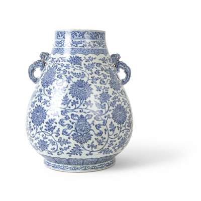 the pear-shaped body rising from a short spreading foot to a short slightly waisted neck flanked by archaistic dragon handles, painted around the exterior with a broad scrolling lotus band, all between ruyihead, foliate scroll and foaming wave bands, the base with a six-character apocryphal seal mark