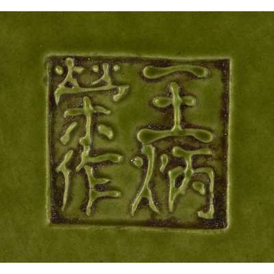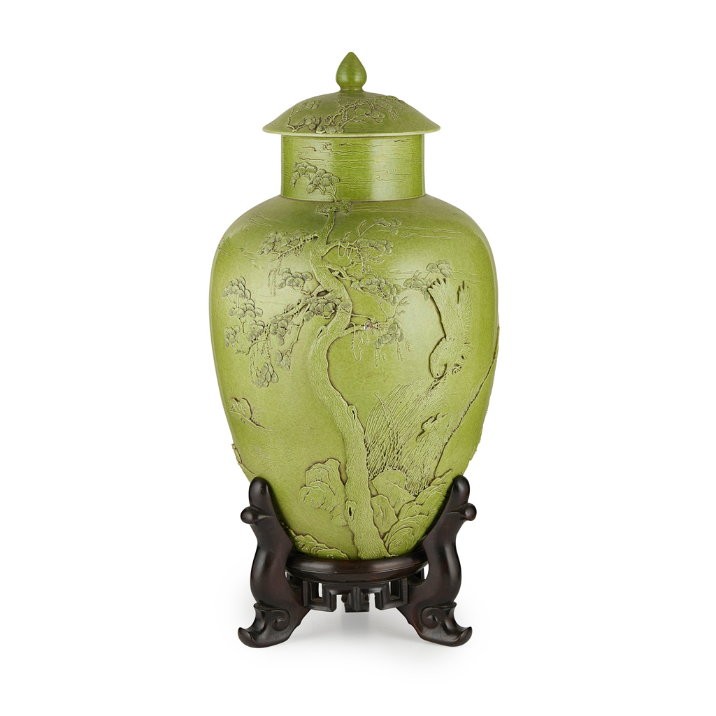 RELIEF-DECORATED GREEN GLAZED OVOID JAR AND COVER