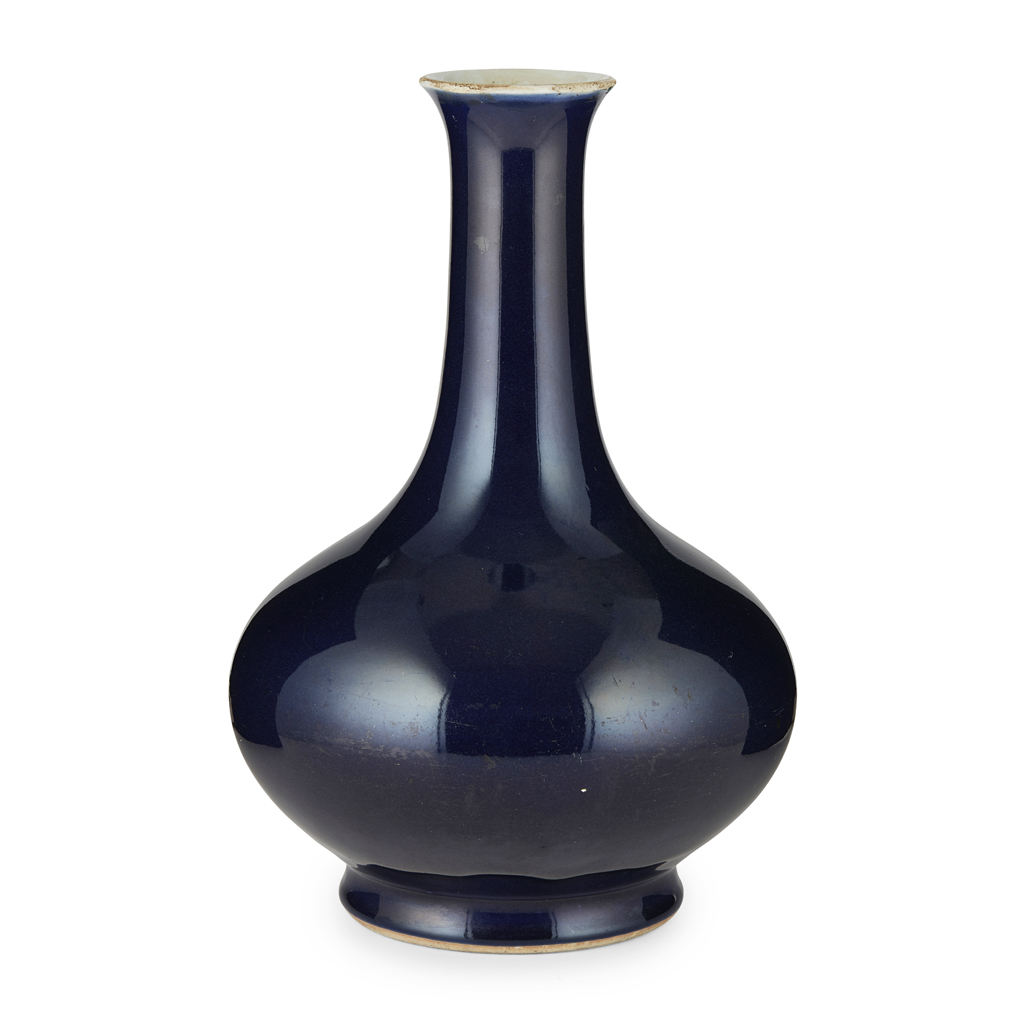 the compressed globular body sitting on a short splayed foot tapering to a waisted neck with a flared mouth, all covered in a lustrous deep blue glaze, stopping neatly at the white foot and mouth rims, the base with a six-character seal mark