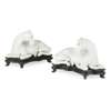 each horse finely modelled in a recumbent position with the legs neatly tucked beneath its body, the head rendered with a combed mane and turned backwards, the body defined with a pronounced spine terminating in a finely incised tail curled along the haunch, wooden stands (2)