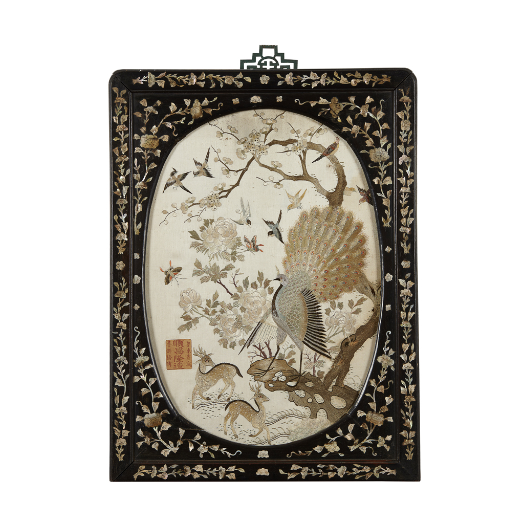 the ivory coloured silk panel intricately worked in a variety of stitches to depict a peacock, swallows, butterflies and a pair of deer gathered around flowering white peony and prunus trees and garden rock, mounted within a hardwood frame inlaid in mother-of-pearl with flowering branches, bearing a stamped 'Shun Chang Long' mark