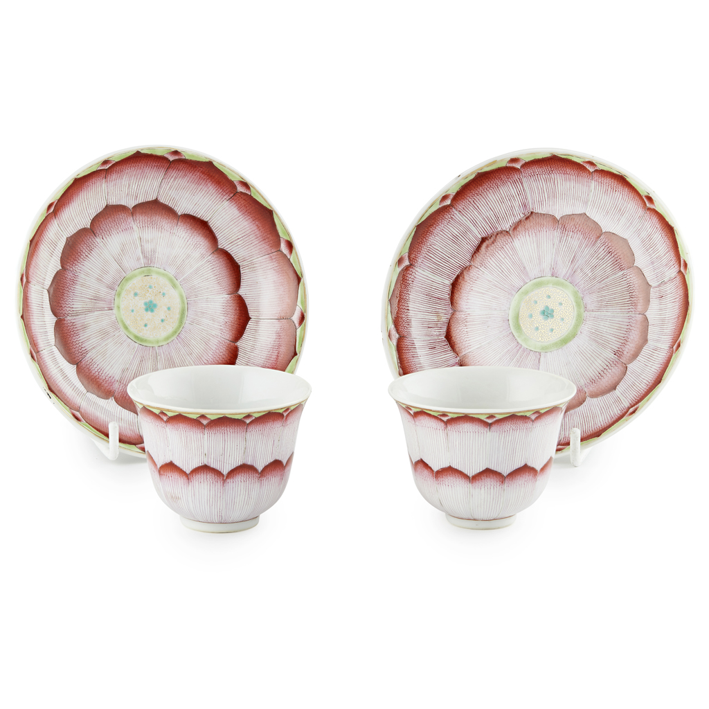 PAIR OF FAMILLE ROSE 'LOTUS' CUPS AND SAUCERS
