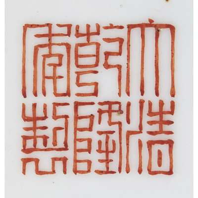 the exterior decorated in variegated pink, turquoise and blue enamels on a brown ground with irregular patches in imitation of puddingstone, the base inscribed with a six-character iron-red Qianlong seal mark
