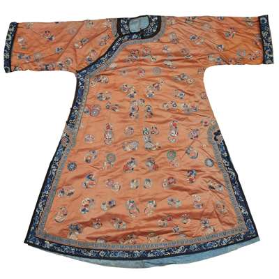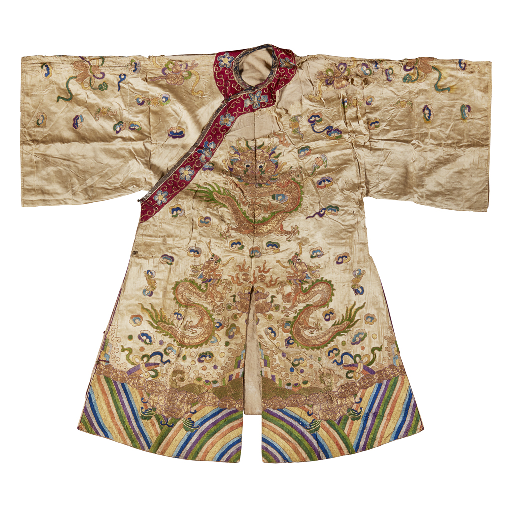 woven with a myriad of small roundels enclosing lotus, peony and chrysanthemum flowerheads, the sleeves and borders embroidered on black grounds with butterflies and flowers; together with an EMBROIDERED SILK CREAM-GROUND 'DRAGON' ROBE, LATE QING DYNASTY, inscribed 'Wu Fu Hao, Foshan' to the interior (2)