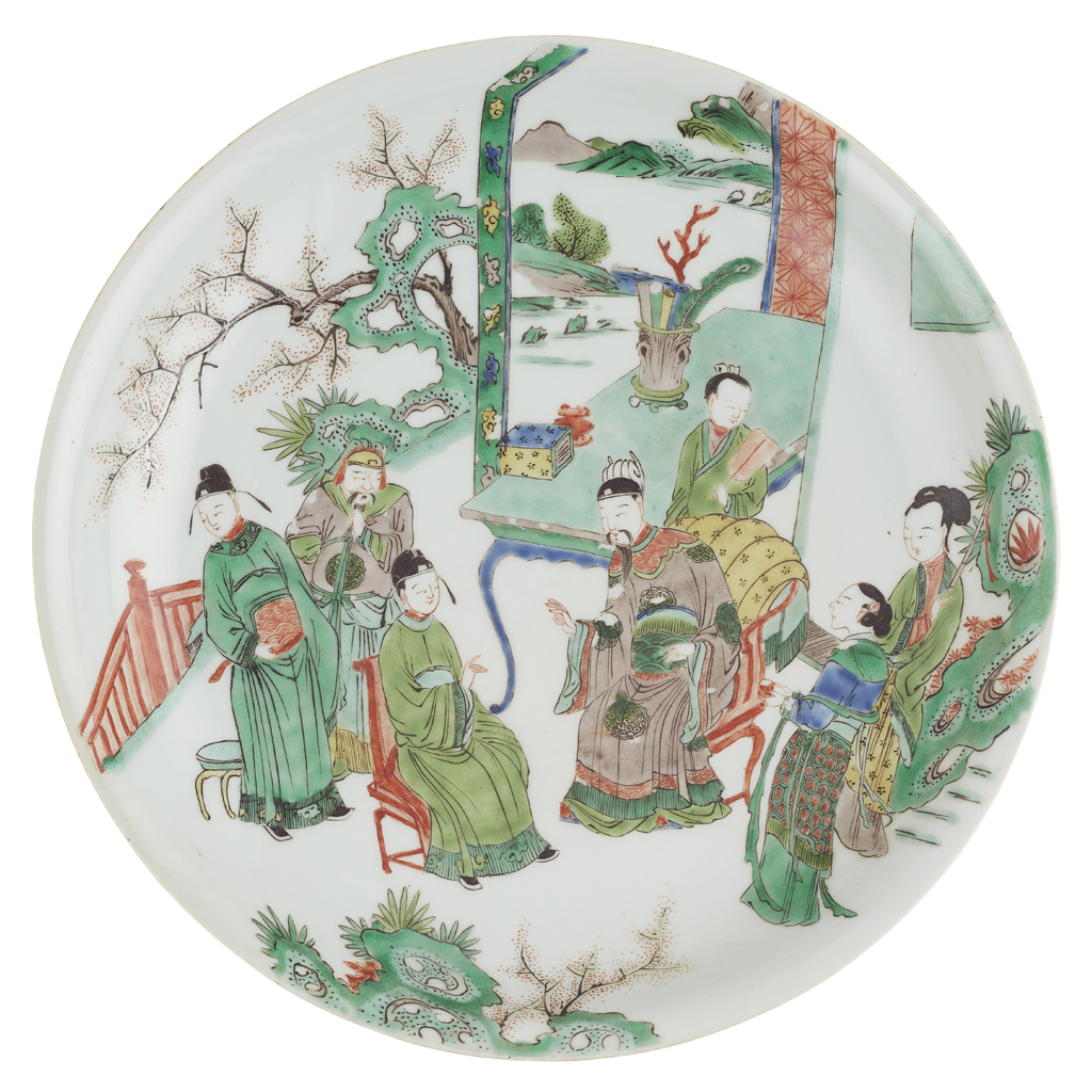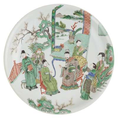 enamelled with an official and a young scholar engaged in conversation, surrounded by friends and servants in a garden setting, unmarked