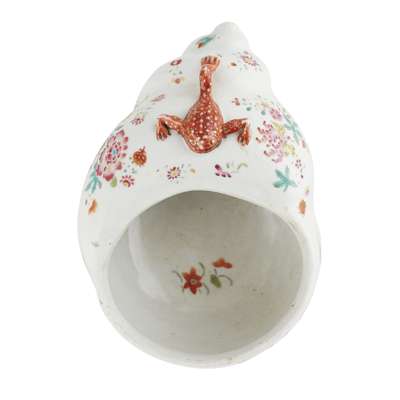 naturalistically worked in the form of a conch shell, the exterior painted in the 'boneless style' with flowering and budding chrysanthemum, rose and daisy, applied with a three-legged toad peering over the lip of the aperture