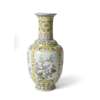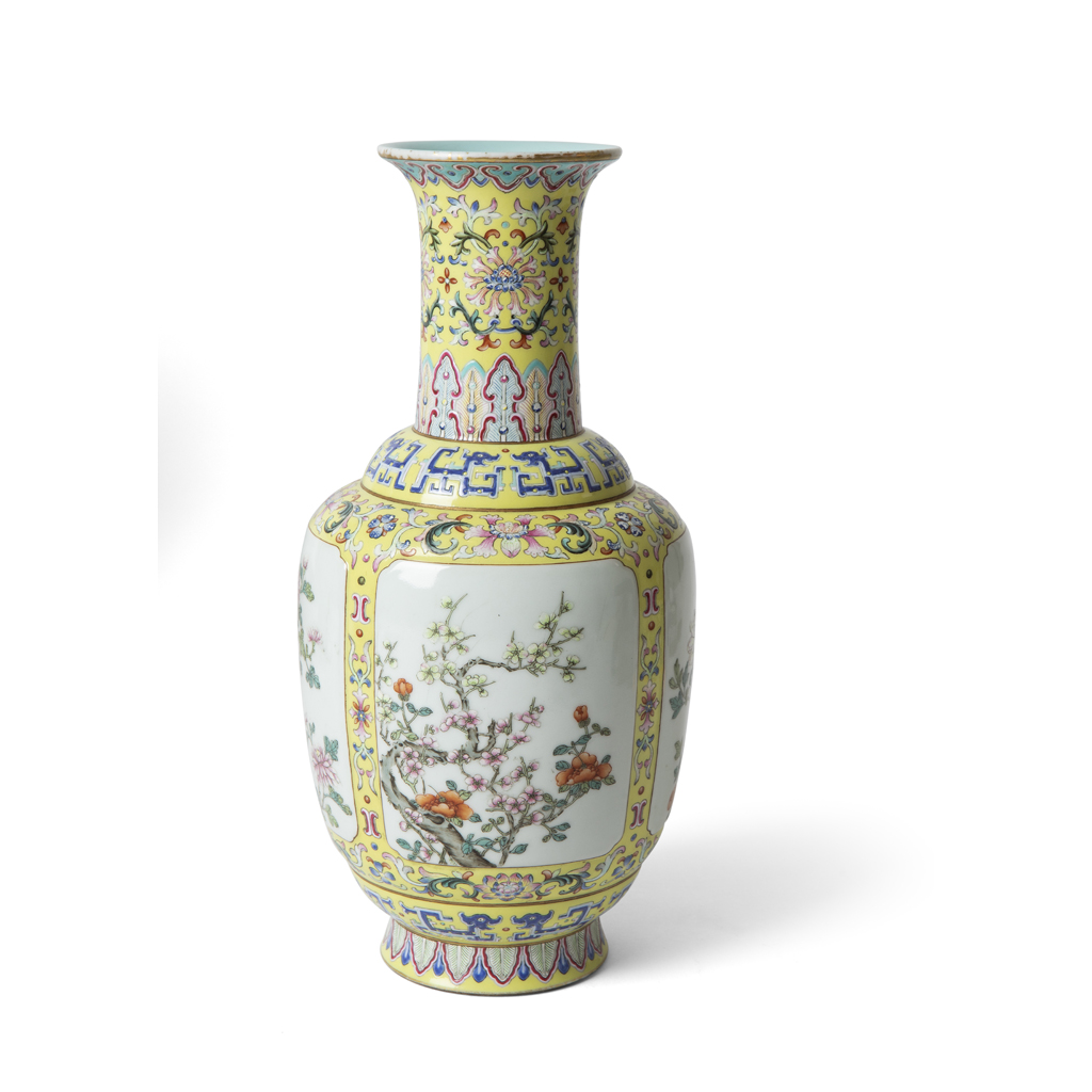 the oviform body decorated with four large panels enclosing blossoming chrysanthemum, lotus, peony and prunus trees, reserved on a bright yellow ground painted with lotus scrolls, pairs of archaistic kuilong dragons, plantain leaves and ruyiheads, the interior and base enamelled turquoise, the drilled base bearing a six-character iron-red Qianlong seal mark
