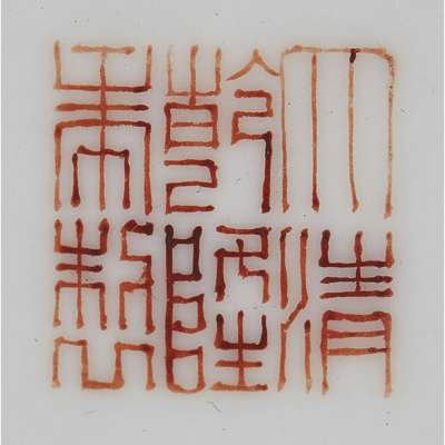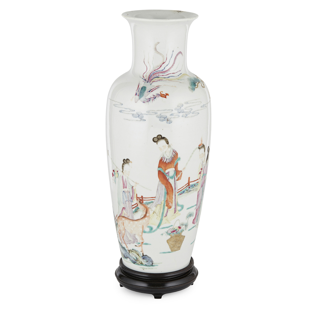 painted with four beauties in a fenced garden below a pine tree, accompanied by a deer, a phoenix hovering above, the base bearing a six-character iron-red seal mark