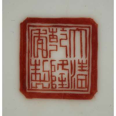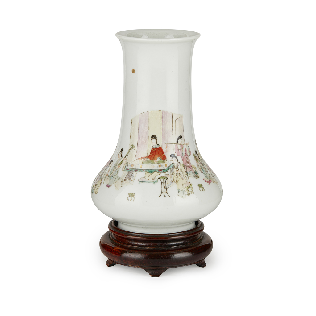 painted with eight beauties playing various musical instruments in front of a floor screen, the one at the centre playing qin supported on an ornate altar table, the base with an apocryphal Qianlong seal mark