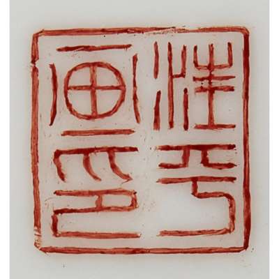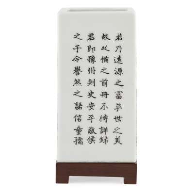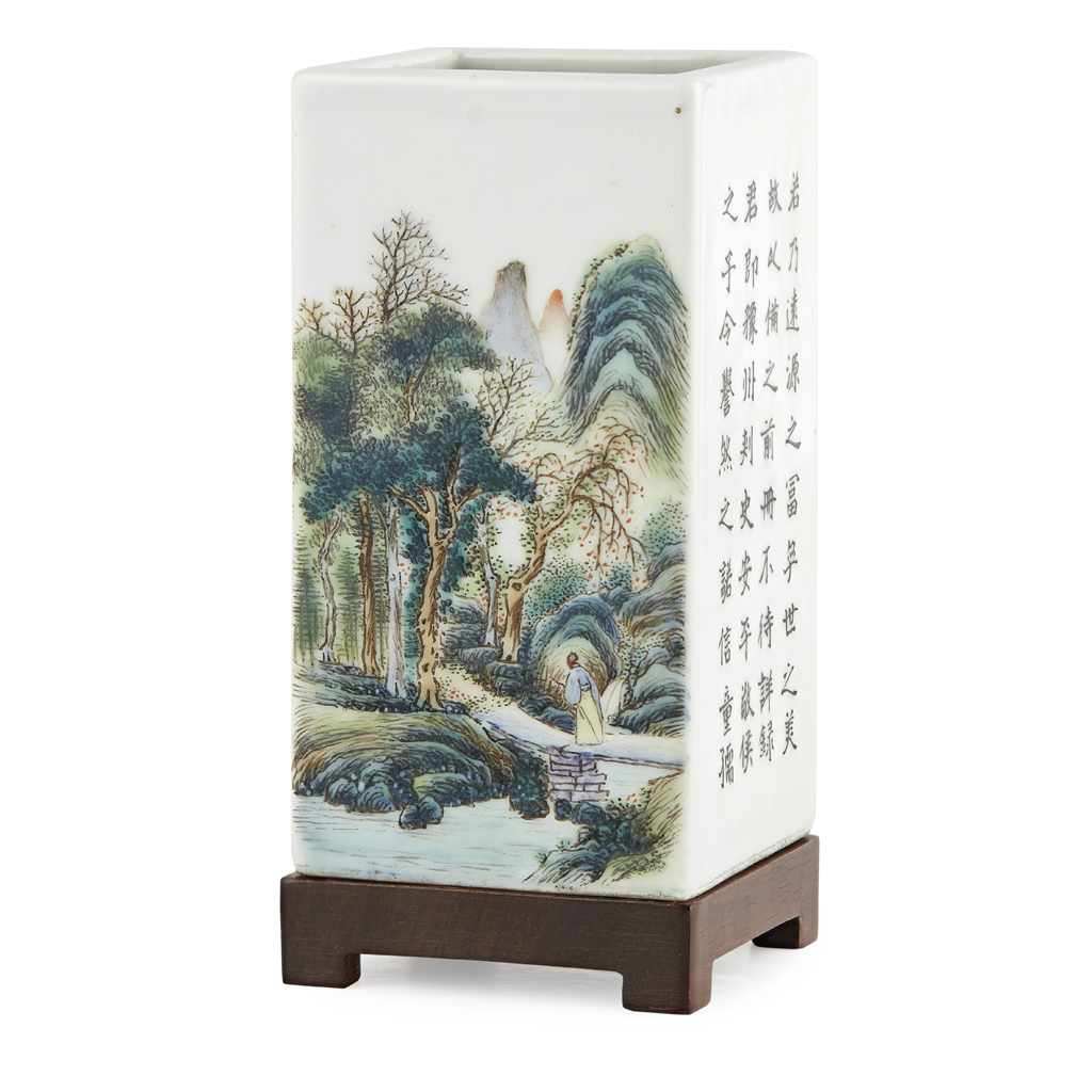 POLYCHROME ENAMELLED AND INSCRIBED SQUARE-SECTION BRUSH POT