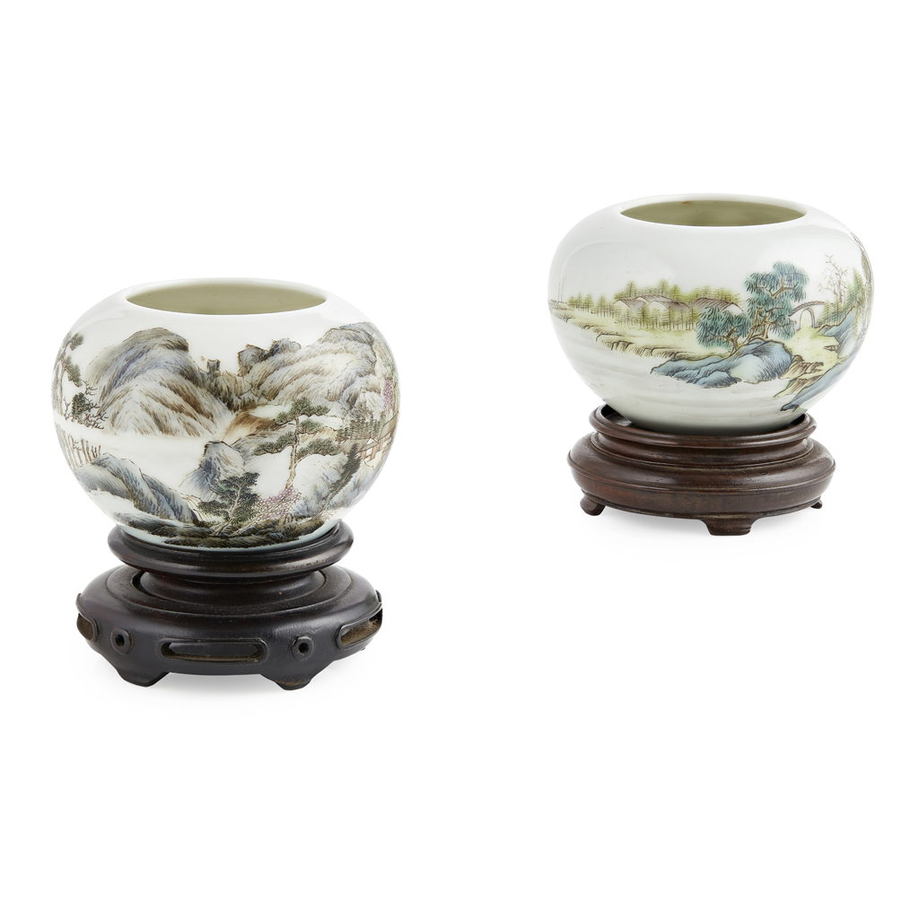 each of globular form, finely painted with a landscape scene detailed with verdant peaks, pine forests and cottages, each bearing a four-character Qianlong seal mark in overglaze blue enamel to the base (2)