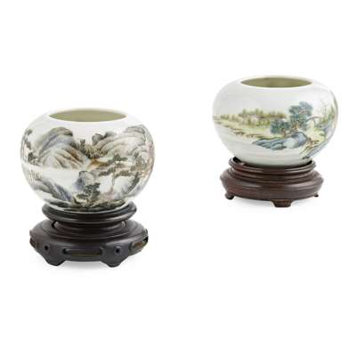 TWO POLYCHROME ENAMELLED 'LANDSCAPE' BRUSH WASHERS