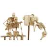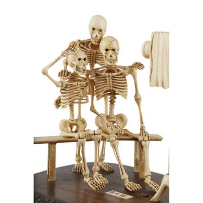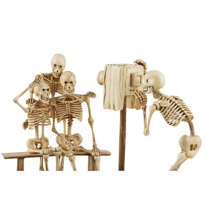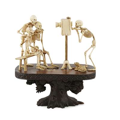 naturalistically carved depicting two skeletons seated on a bench and a third one standing behind, the trio posing for the camera operated by a fourth skeleton as the photographer, the group supported on an oval plinth raised on a tall foot simulating a pine tree, signed and sealed Shutaro within an inlayed rectangular plaque