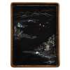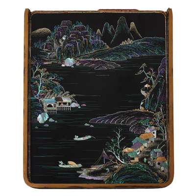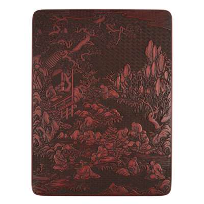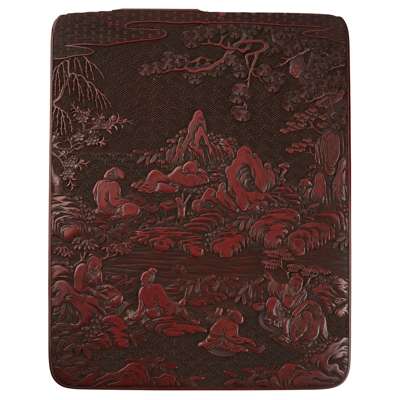 the paper box finely carved with ten elderly scholars dressed in Chinese attire and engaged in various leisurely pursuits such as calligraphy exercise and tea tasting, the interior inlaid in abalone shell with a lakeside village scene, the writing box similarly decorated with six scholars at leisure in a mountainous landscape, the interior fitted with an inkstone (2)