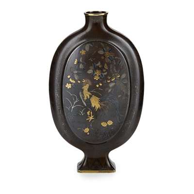 decorated in copper, gilt, shakudo and bronze with a cockerel surrounded by flowering cherry branches within a large oval cartouche, and with butterflies amongst peonies on the reverse, the scenes flanked by scrolling foliage on the shoulders