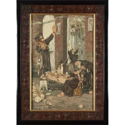 UNUSUAL EMBROIDERED SILK PANEL DEPICTING BENEDICTINE MONKS TESTING WINE