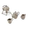 comprising: a compressed globular teapot and stand; another teapot; a cream jug; and a sugar bowl, each finely repoussé worked with panels enclosing figures at leisure surrounded by pavilions, reserved on a dense 'birds and flowers' ground, each item marked 'De Chang' in Chinese and 'C.S.' (4)