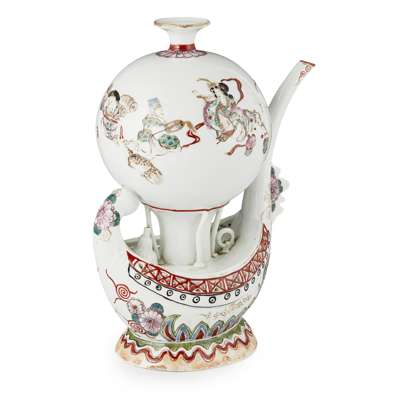 modelled as a hot-air balloon tethered to a gondola, the prow of the boat rising to form the spout, the stern curving inwards to form the handle, the exterior of the balloon painted with the Seven Lucky Gods