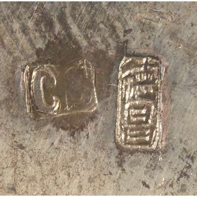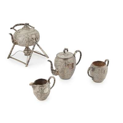 comprising: a compressed globular teapot and stand; another teapot; a cream jug; and a sugar bowl, each finely repoussé worked with panels enclosing figures at leisure surrounded by pavilions, reserved on a dense 'birds and flowers' ground, each item marked 'De Chang' in Chinese and 'C.S.' (4)