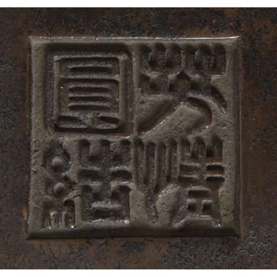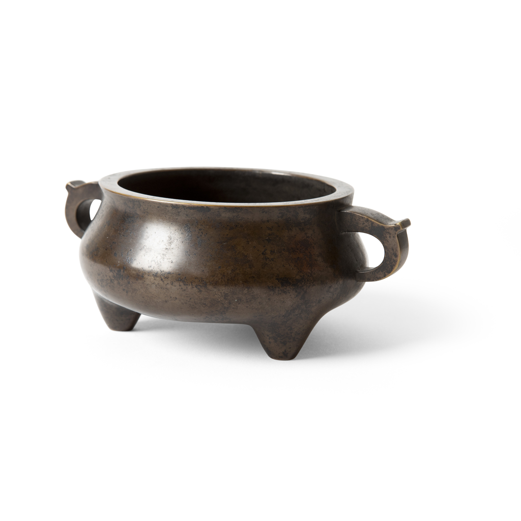 the heavily cast compressed spherical body rising to a wide mouth, flanked by a pair of loop handles, supported on three conical legs, covered in an even dark brown patina, the base with a cast four-character mark