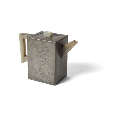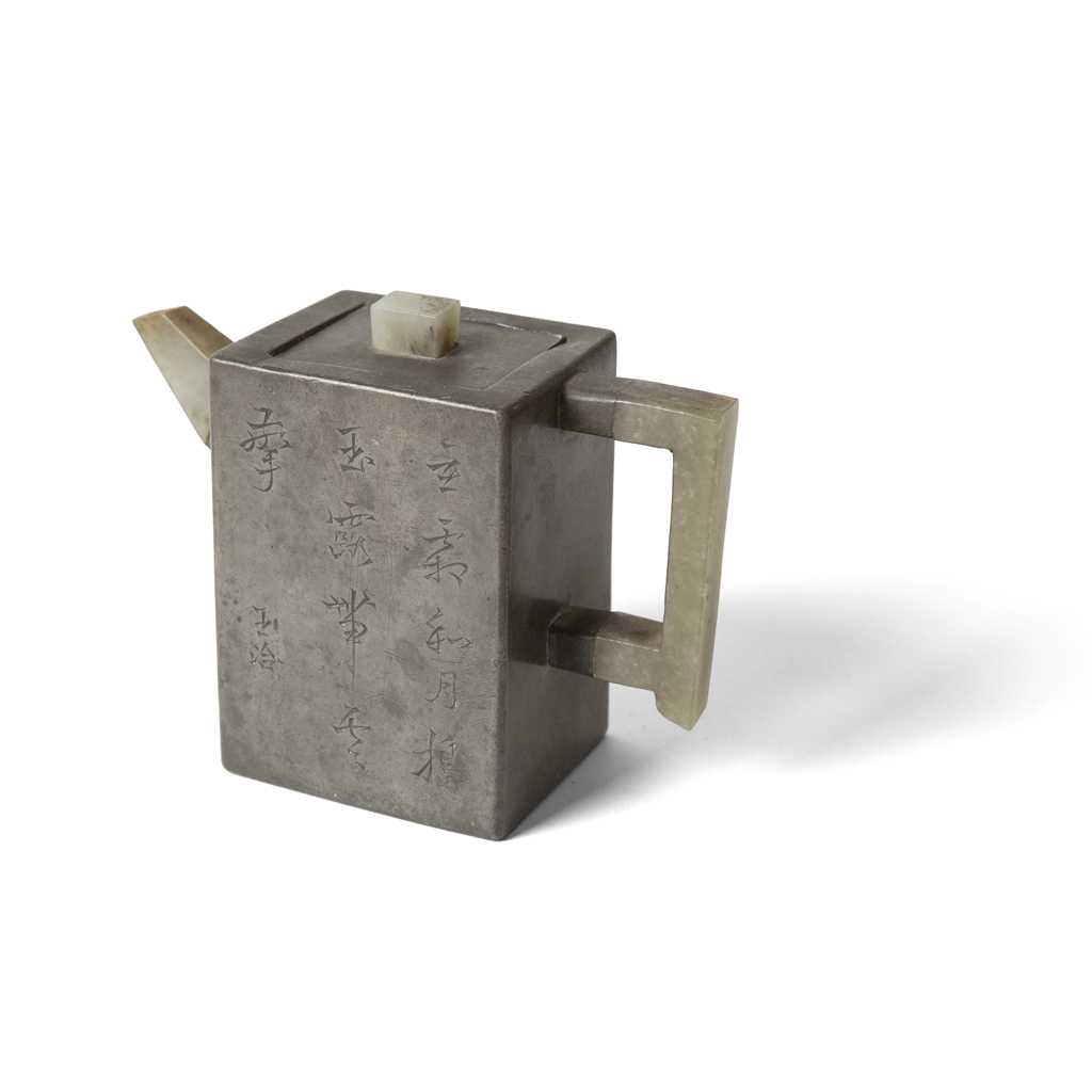 of rectangular section, mounted with a jade spout, handle and finial, engraved with a two-line poetic stanza, signed Wang Qia