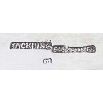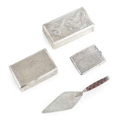 comprising: a rectangular box, the cover embossed in high relief with a writhing dragon, marked 'Tackhing', '90% Silver' and 'M' to the base, engraved with the dedicatory inscription reading 'From Mr & Mrs B. S. Vieira, Hong Kong, 31st March, 1952'; another rectangular box, the cover decorated with leafy bamboo branches, marked 'Tackhing', '90% Silver' and 'M' to the base; a card case, engraved with the dedication 'Presented to Richard Cassidy by the Chinese staff of John D. Hutchison & Co, Ltd. on the occasion of his marriage, 29th August, 1947'; and a cake slice with mark of the University of Hong Kong (4)