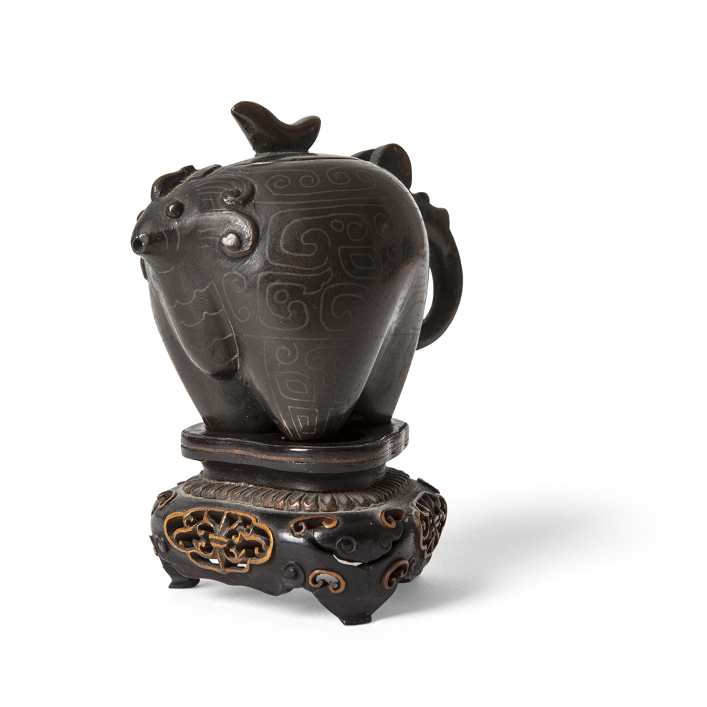 modelled in the form of a three-legged mythical beast with the head of a ram forming the spout, the lid surmounted by a bird finial, with inlaid silver archaistic scrolls, wooden stand