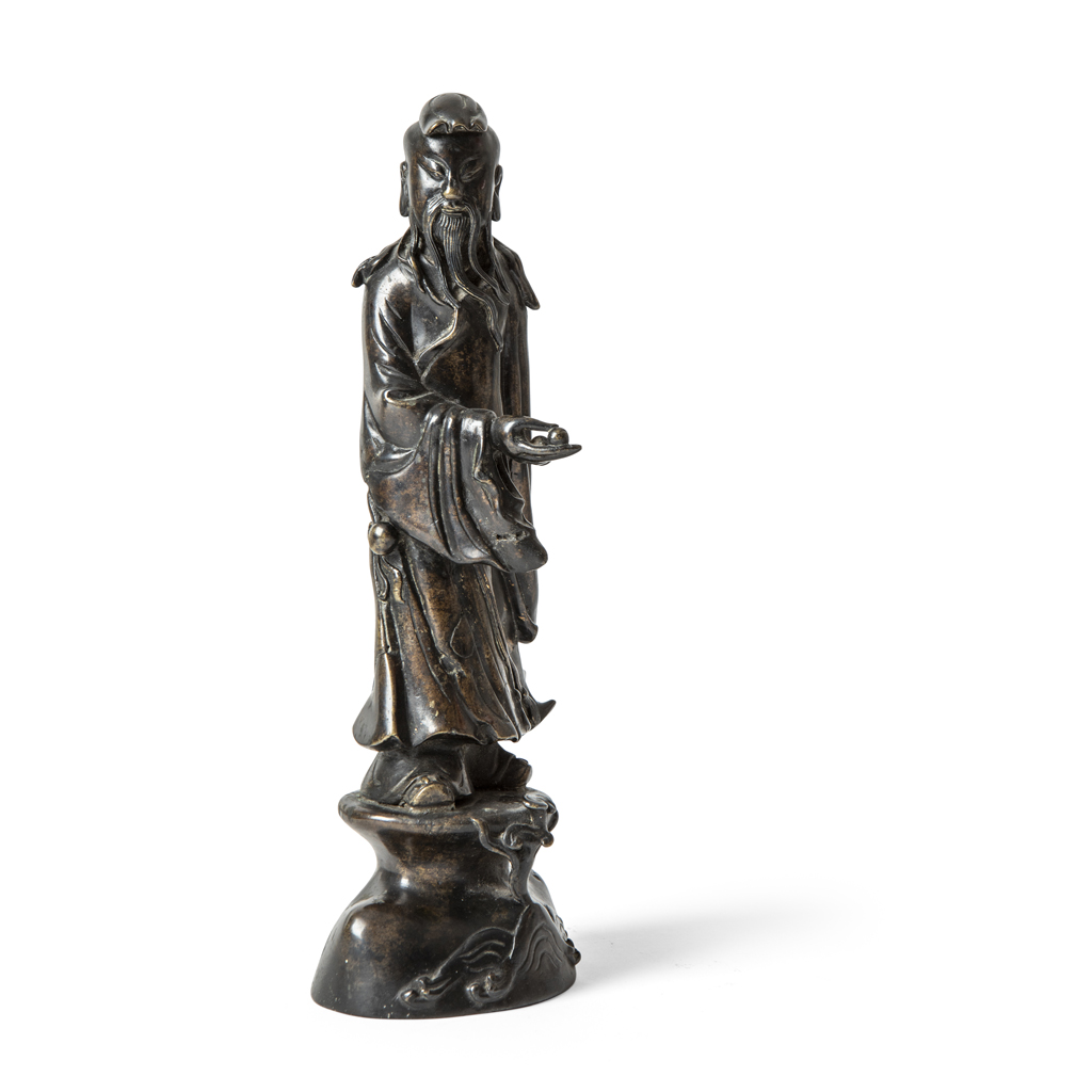 the immortal portrayed standing elegantly with a meditative expression, dressed in long flowing robes, the right hand holding a pearl