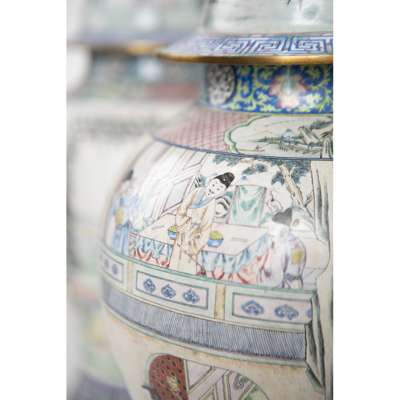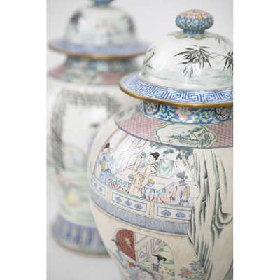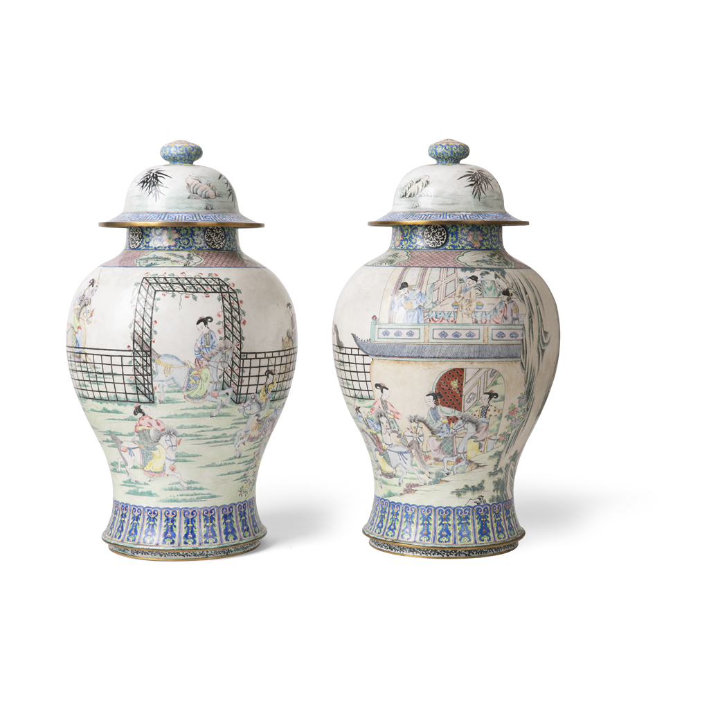 PAIR OF LARGE CANTON ENAMEL 'GENERALS OF THE YANG FAMILY' BALUSTER VASES AND COVERS