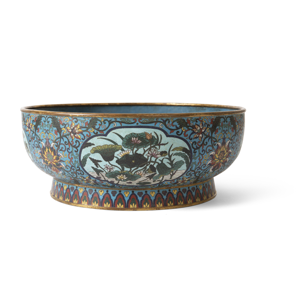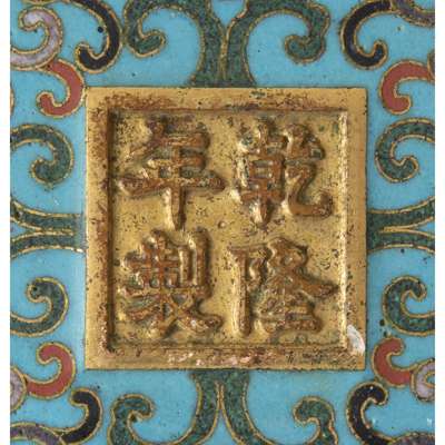 the exterior decorated with four quadrelobed panels enclosing flowering lotus, chrysanthemum, prunus and peony, reserved on a lotus scroll ground above a band of upright lappets at the foot, the base with a gilt four-character apocryphal mark
