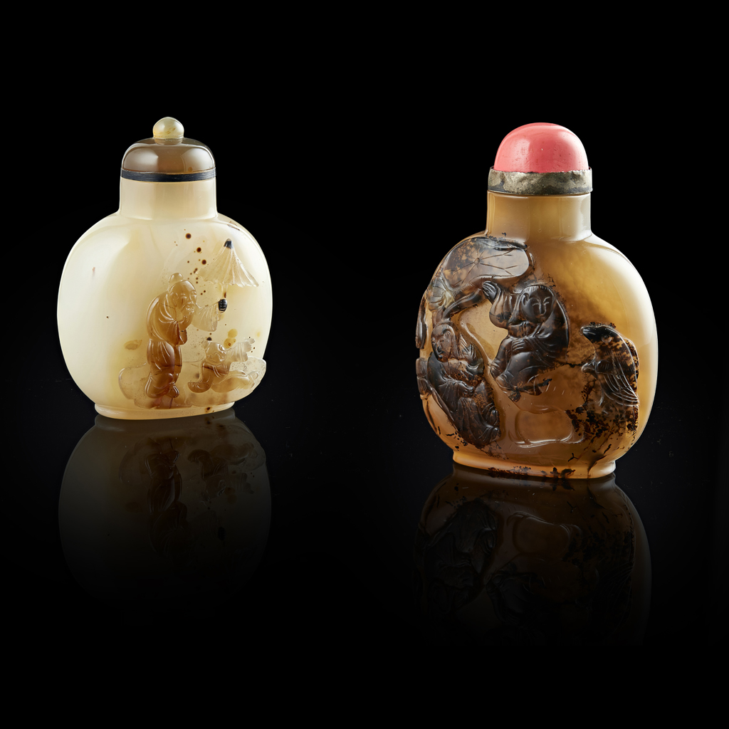 TWO FINELY CARVED AGATE SNUFF BOTTLES Y