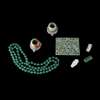 comprising: a pair of archers rings mounted on silver tripod stands; a pierced 'phoenix and lotus' plaque; a miniature scent bottle in the form of a vase; a small spinach-green jade 'dragon' plaque mounted on a white metal clip; a small white jade plaque depicting an immortal holding a lotus spray, also mounted on a white metal clip; and a green hardstone necklace (7)