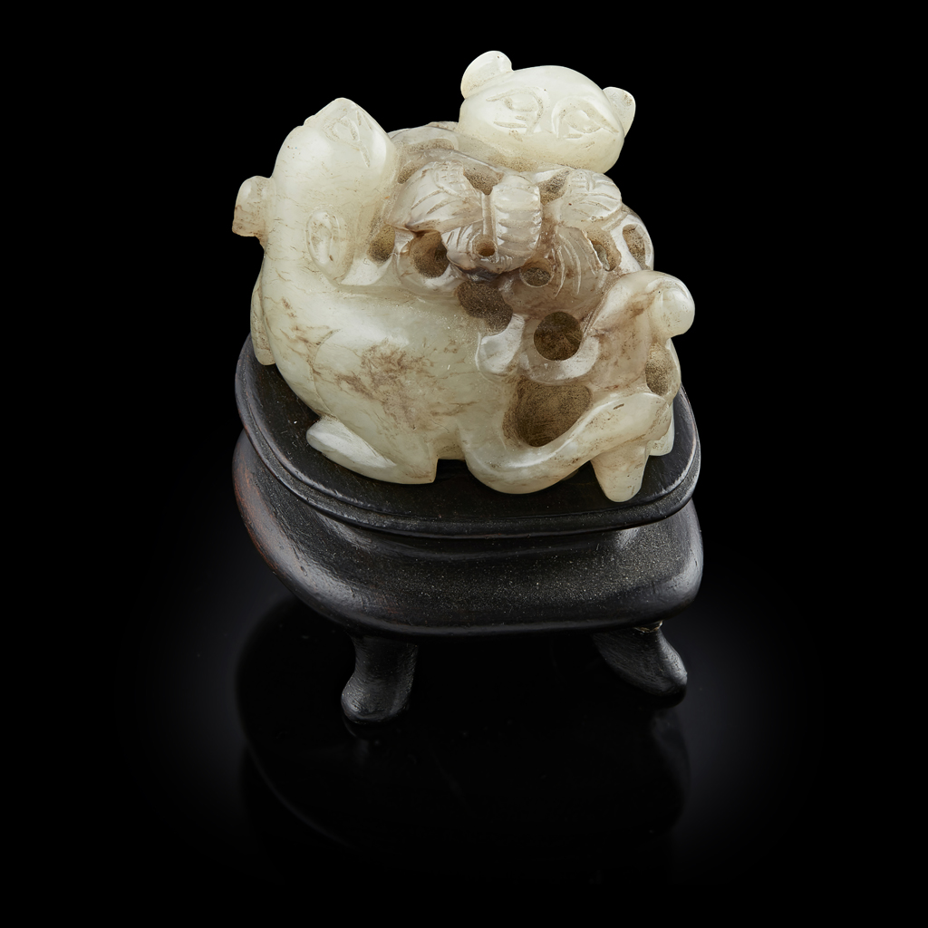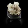 depicting a pair of cats playing with a lingzhi spray with a bat perched on top, carved and pierced from a greyish white translucent stone mottled with darker inclusions
