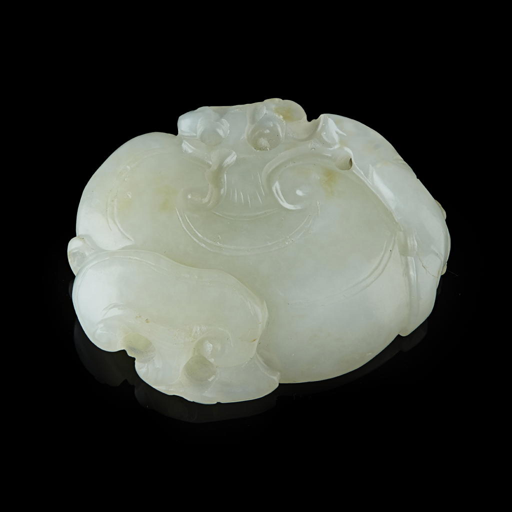 carved as a large lingzhi fungus with a bat perched on top, the stone of a pale celadon tone with light russet patches